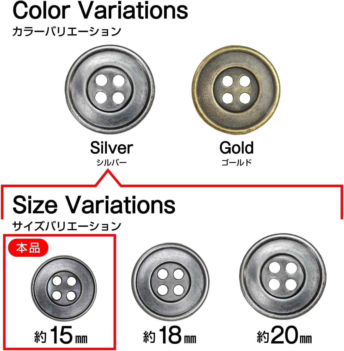 メタルボタン 四つ穴 シンプル【 アンティークシルバー】銀 丸ボタン 金属 手芸 10個入【15mm】きらきらぷんぷん丸 B-1273