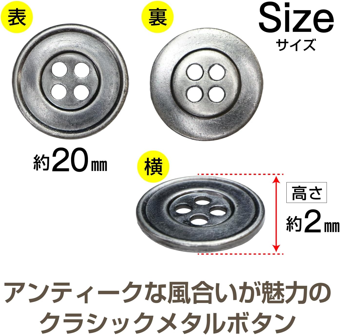 【特 徴】洋服やハンドメイド作品に落ち着いた存在感を添える、アンティーク調の金属製ボタンです。ほどよくくすんだ古美色(アンティークシルバー) が服飾はもちろん、レザークラフト・バッグ・ニット作品など幅広いアイテムにマッチします。