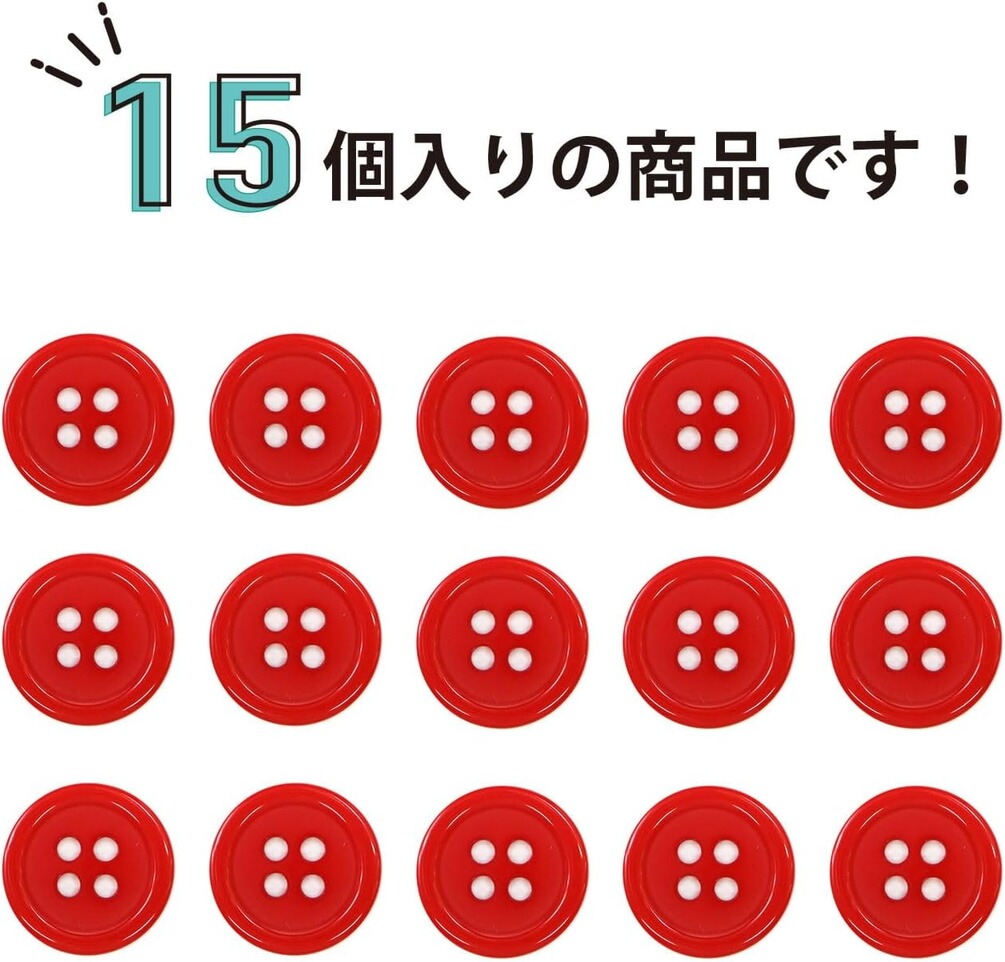 四つ穴ボタン 【レッド】 赤 ツヤあり カラー ボタン シャツボタン 15個入り 【15mm】 ボタンマート B-830