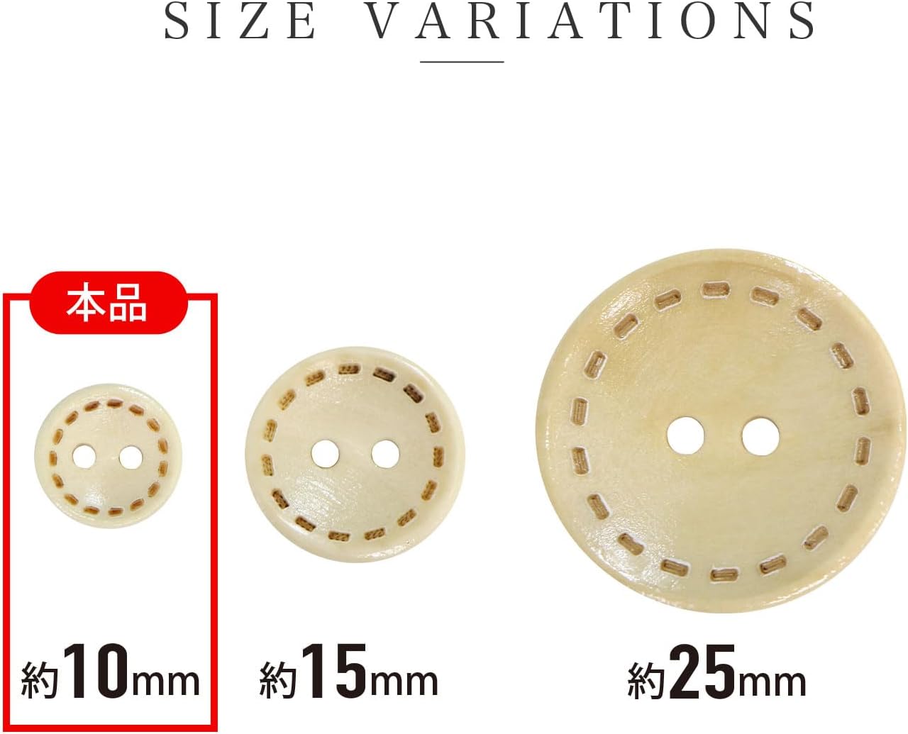 温もりのある木の風合いと、ステッチ風の点線模様が魅力の二つ穴ボタンです。
