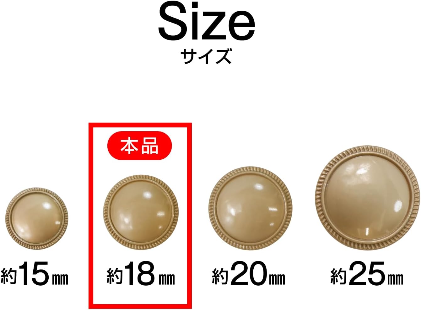 フチありメタルボタンは、用途に合わせて4サイズを展開。コートからワイシャツ、ハンドメイド作品など幅広いアイテムにマッチします。